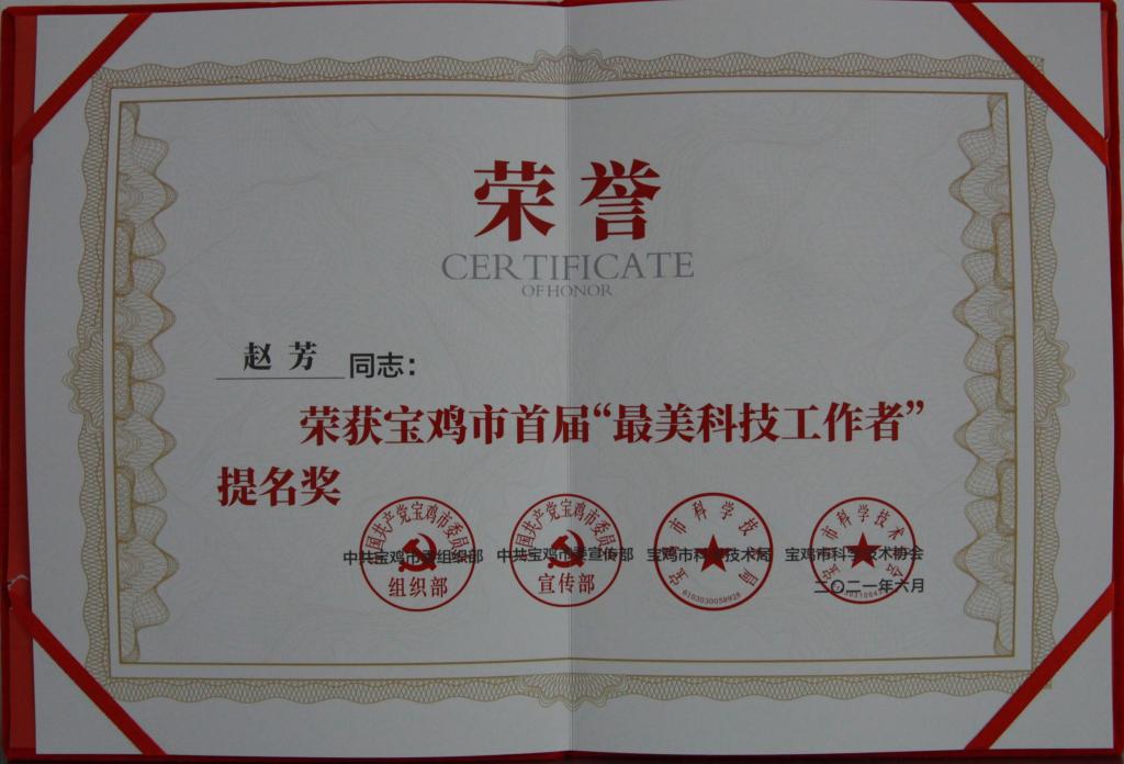 近日,寶光股份趙芳在中共寶雞市委組織部、中共寶雞市委宣傳部、寶雞市科學(xué)技術(shù)局、寶雞市科學(xué)技術(shù)協(xié)會(huì)聯(lián)合開(kāi)展的“尋找寶雞最美科技工作者”評(píng)比活動(dòng)中,被授予2021年“優(yōu)秀科技工作者”提名獎(jiǎng)。