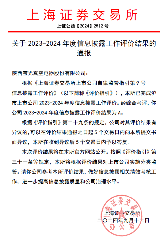 日前,上海證券交易所(以下簡稱“上交所”)發(fā)布了《滬市上市公司2023至2024年度信息披露工作評價結果》,寶光股份(600379)榮獲信息披露工作最高考核評級A級,這是公司首次獲此榮譽,是上交所對寶光股份信息披露、公司治理、投資者關系管理、履行社會責任等方面的高度認可和肯定。