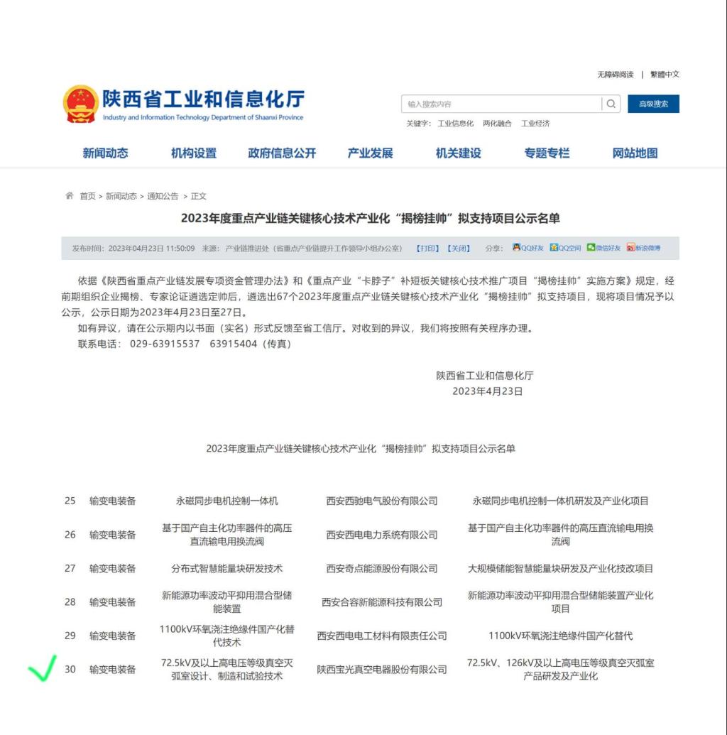 通過認(rèn)真籌備、資料審核及現(xiàn)場答辯,由公司組織申報的“72.5kV、126kV及以上高電壓等級真空滅弧室產(chǎn)品研發(fā)及產(chǎn)業(yè)化”項(xiàng)目與“高鐵車載開關(guān)用真空滅弧室智能化產(chǎn)線建設(shè)”項(xiàng)目分別中榜陜西省工信廳2023年關(guān)鍵核心技術(shù)產(chǎn)業(yè)化“揭榜掛帥”項(xiàng)目與重點(diǎn)產(chǎn)業(yè)鏈發(fā)展項(xiàng)目,并已進(jìn)入公示階段。
